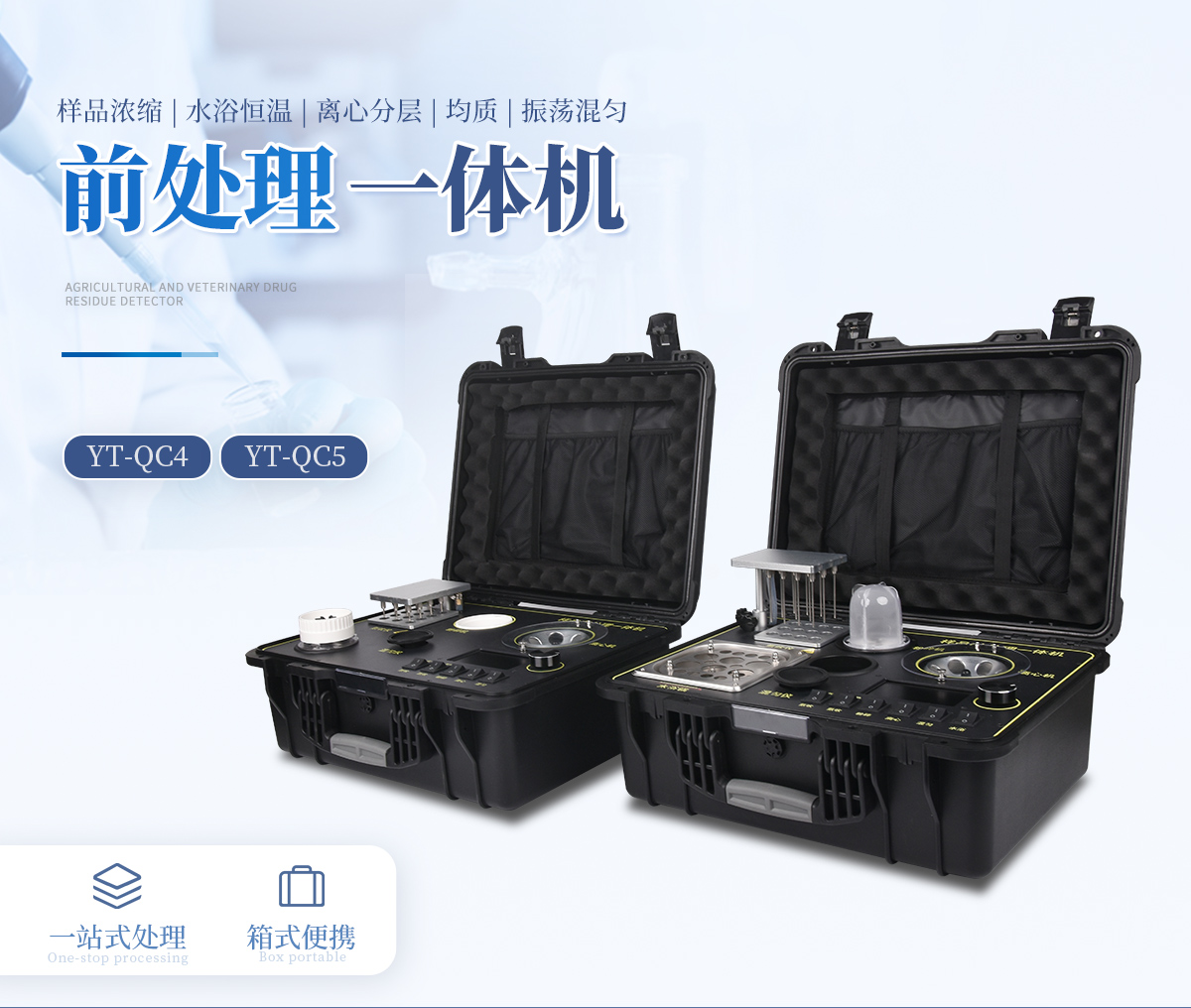 應國內用戶的實際需求,自行研制開發的新型儀器——QC05型樣品前處理一體機。樣品前處理集成箱將樣本前處理過程中樣品濃縮、水浴恒溫、離心分層、均質、振蕩混勻等步驟所需設備進行集成,僅需一臺樣品前處理集成箱設備即可完成所有樣本前處理過程,并且方便攜帶,不僅適用于現場檢測使用,還可用于色譜、質譜等分析樣品的純化和制備。