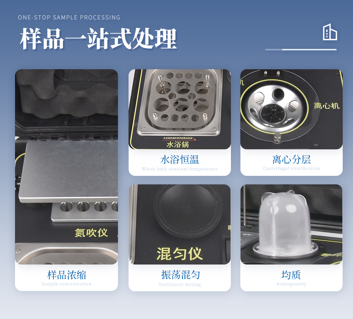 | 1、功能緊湊,集成五種樣品前處理常用的功能,完成樣品一站式處理。 | 2、結構穩固,機箱采用***工程塑料,具備**的抗沖擊性、耐腐蝕性、便攜性。 | 3、操作穩定,機器采用五寸全彩色液晶屏,功能指示性強,用戶操作均為實體開關,杜絕佩戴手套和液體噴濺時的操作失效。 |
