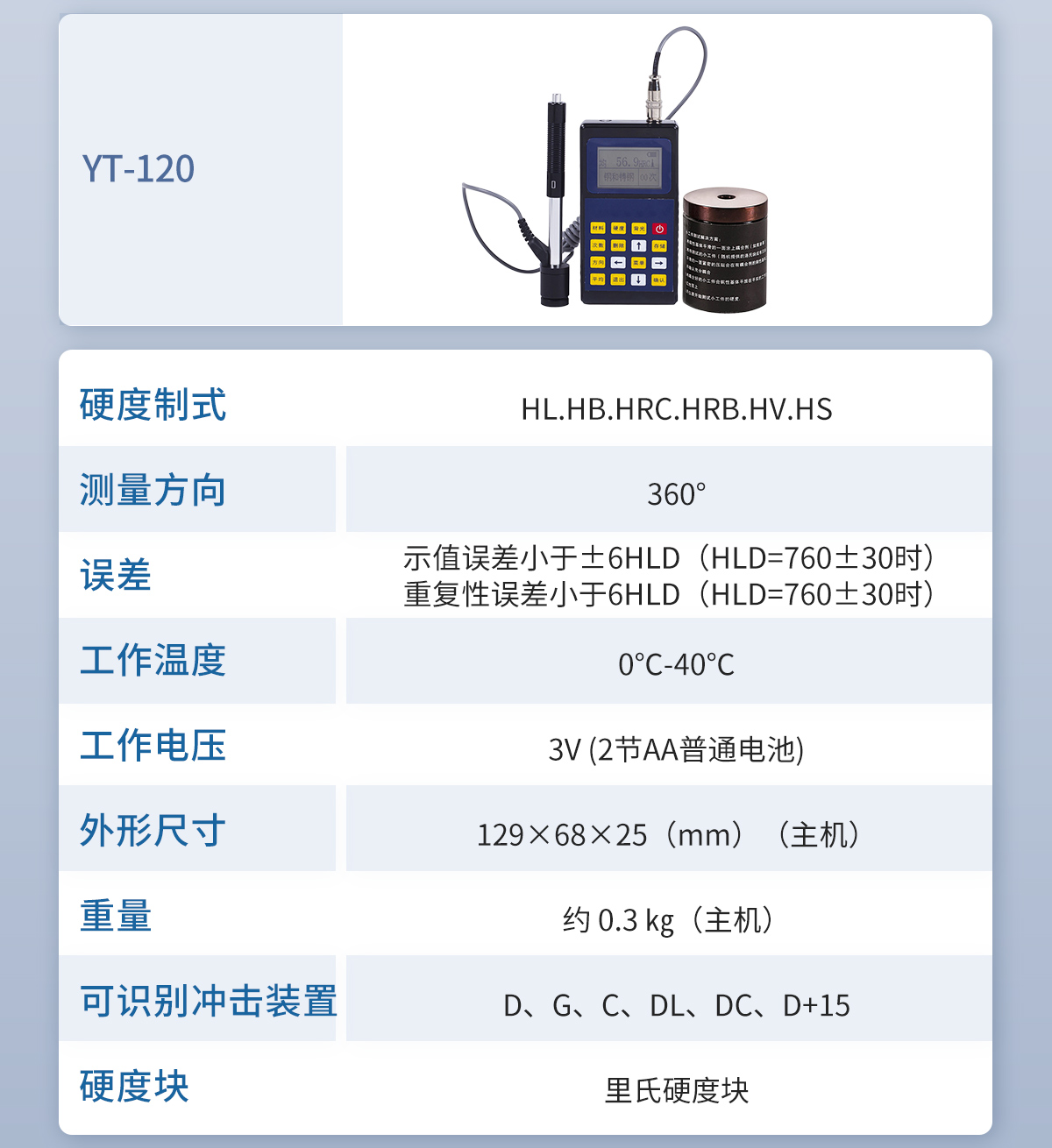 | 測量范圍 | (127~651)HB,(59.6~99.6)HRB,(17.9~68.5)HRC,(59.1~85.8)HRA,(83~976)HV,(32.2~99.5)HS,(150-960)HLD,可定制測量值范圍 |