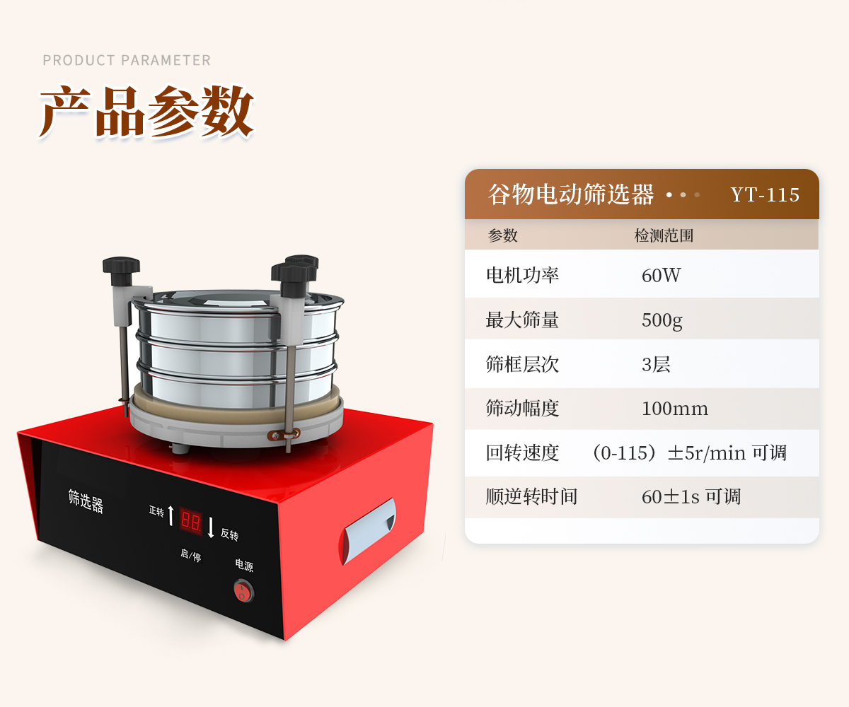 產品描述:一、用途主要用于谷物選篩二、技術參數1、電機功率:60W;2、**篩量:500g;3、篩框層次:3層;4、篩動幅度:100mm;5、回轉速度:(0-115)±5r/min 可調;6、順逆轉時間:60±1s 可調;【詳情】  更新時間:2026-04-12