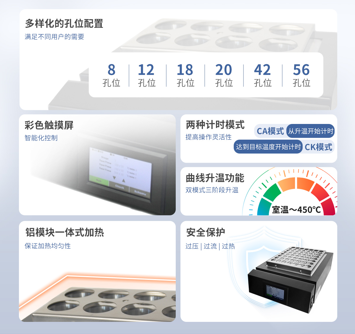 產品描述:一.適用范圍:1. 氮與蛋白質測試的樣品消化制備;2. COD消化,總磷、砷等的消化;3. 重金屬消化(鉛 銅 鋅 錫等)。二.功能特點:1. 8,12,18,20,42,56多種孔位滿足不同需求用戶;2. ☆彩色觸摸屏,界面簡潔、操作簡單;3. ☆智能化控制、時間控制、曲線升溫功能(雙模式三階段升溫)。雙模式分別為:【詳情】  更新時間:2026-04-13