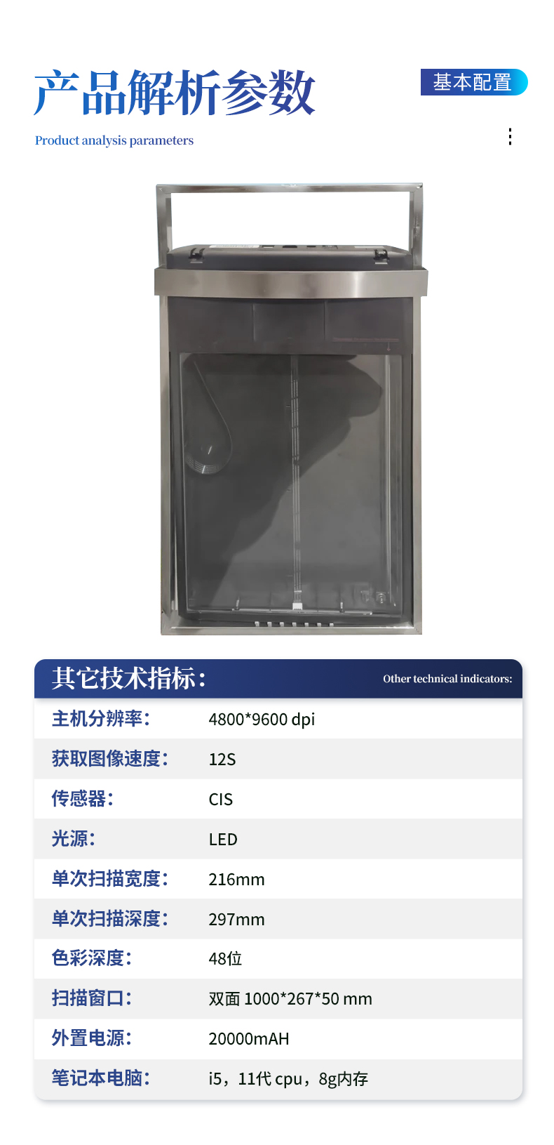主機(jī)分辨率:4800*9600 dpi 獲取圖像速度:12S 傳感器:CIS 光源:LED 單次掃描寬度:216mm 單次掃描深度:297mm 色彩深度:48位 掃描窗口:雙面 1000*267*50 mm 外置電源:20000mAH 筆記本電腦:i5,11代 cpu,8g內(nèi)存