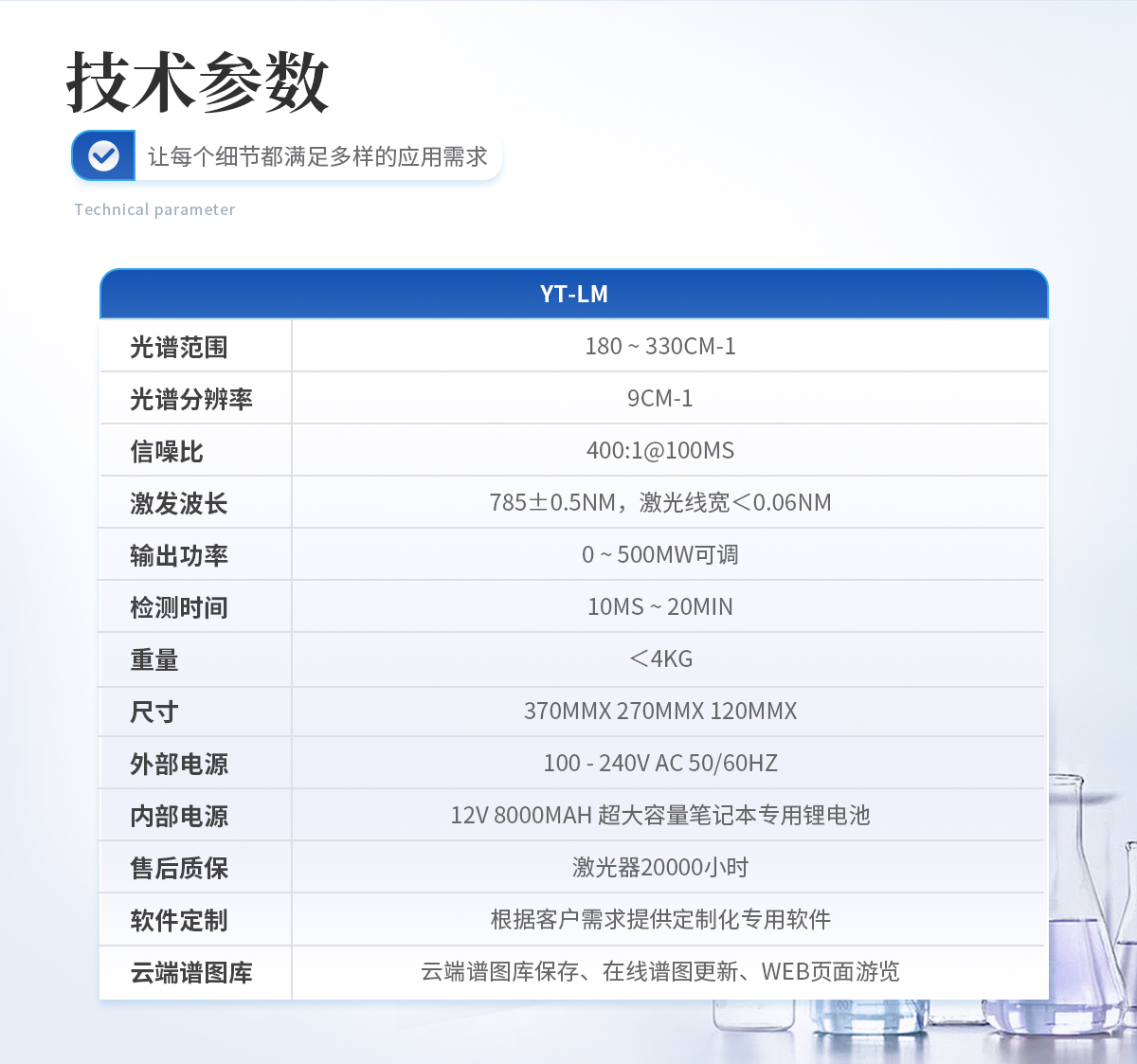 規格:YT-LM標準版 光譜范圍:180 ~ 3300cm-1 光譜分辨率:9cm-1 信噪比:400:1@100ms 激發波長:785+0.5nm,激光線寬< 0.06 nm 輸出功率:0~ 500mW可調 檢測時間:10ms ~ 20min 重量:<4kg 尺寸:370mmx 270mmx 120mm 外部電源:100-240V AC 50/60Hz 內部電源:12V 8000mAH 超大容量筆記本專用鋰電池 售后質保:激光器20000小時 軟件定制:根據客戶需求提供定制化專用軟件 云端譜圖庫:支持云端譜圖保存、 在線譜圖更新、WEB 頁面瀏覽