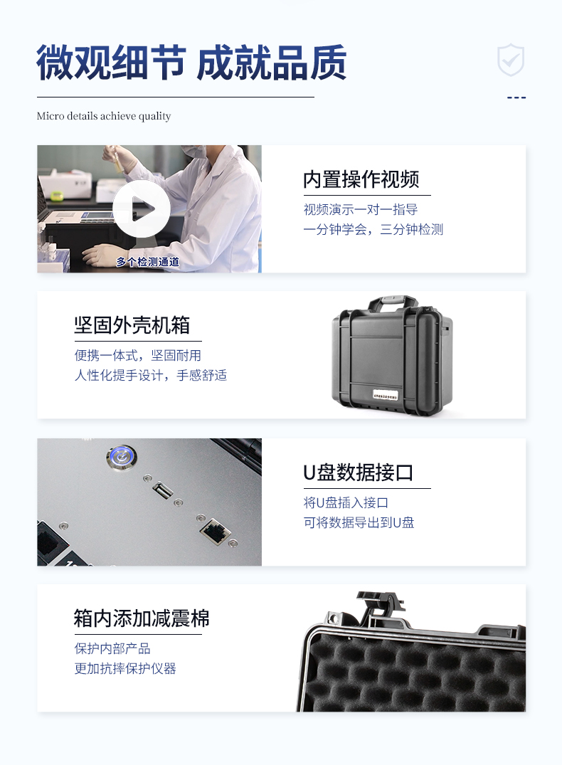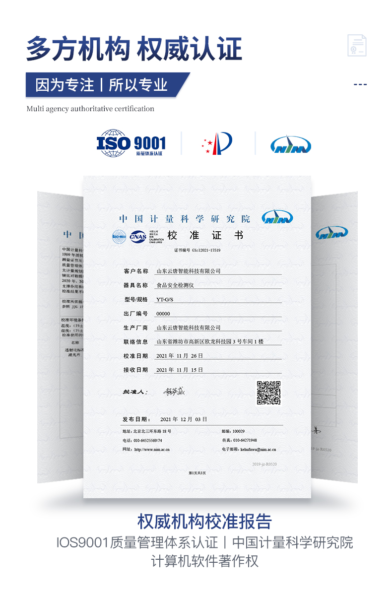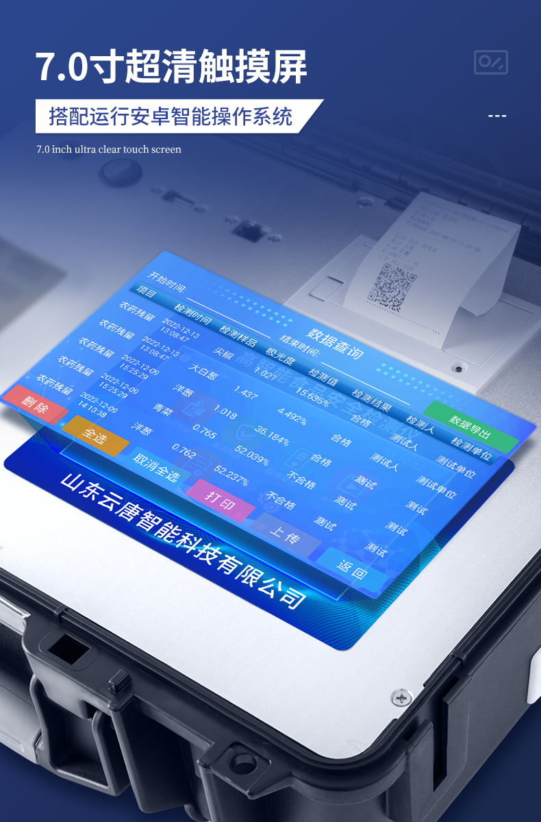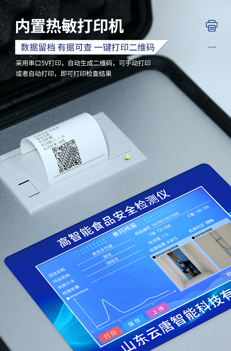 | 安卓智能操作系統,采用更加**的UI交互界面,儀器具有wifi聯網上傳、4G聯網傳輸、GPRS無線遠傳、網線連接功能,快速批量上傳數據。 | 智能化程度高,儀器具有自檢功能:具有開機自檢和調零功能,具有自動檢測重復性功能。 | 新一代高速熱敏打印機,檢測完成可自動打印或批量打印檢測報告和二維碼。 | 儀器帶有監管平臺,數據可局域網和互聯網數據上傳,檢測結果直接傳至食品安全監管平臺。進行區域食品安全監管及大數據分析處理與數據統計,檢測區域食品安全長短期動態,達到食品安全問題預估、預警 | 一體化主機,包含食品安全檢測模塊、多通道農藥殘留檢測模塊、膠體金免疫層析檢測模塊。 | 一體化便攜式快檢設備,滿足現場及流動檢測使用需求,能夠在同一軟件下實現所有檢測項目的檢測,并可通過同一窗口直觀顯示檢測結果。 | 膠體金模塊檢測方式:軌道式自動傳輸掃描,檢測完成后自動退出檢測卡。 | 食品安全檢測儀CT線自動識別,無需手動調整,檢測完成自動顯示CT坐標曲線。 | 內置強大的數據庫,具有多品類多種類樣品菜單功能,可靈活選擇檢測樣品,不同的檢測通道可同時檢測不同的樣品項目。也可在儀器上直接編輯錄入樣品名稱、檢測指標、送檢單位等信息并保存進樣品數據庫。 | 產品內置操作演示視頻,是您身邊的化驗指導專家。 | 樣品處理簡單省力,整體操作快速、安全、便捷。 | 儀器具有自身保護功能,可設置用戶名及密碼,防止非工作人員操作等。 | 高靈敏度,高檢測精度,高重復性精度,掃描式高精度光學傳感器。 | 結果判定線可修改,對照值標定值可保存,斷電不丟失數據。 | 兼容市場上所有的膠體金卡,使用耗材不受限制,極大增強用戶使用體驗。 | 儀器具有重新校準、鎖定、恢復出廠設置功能。 |