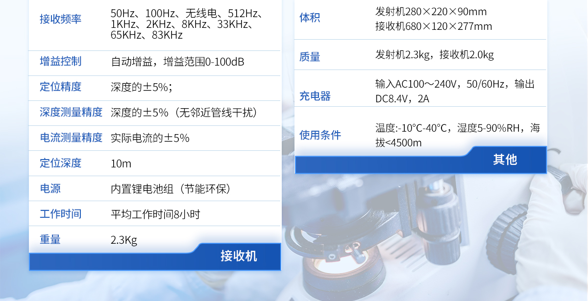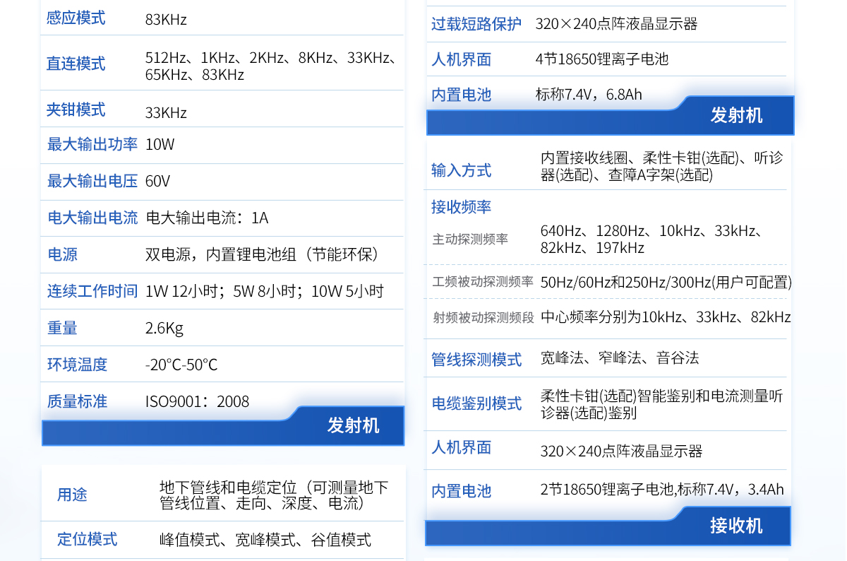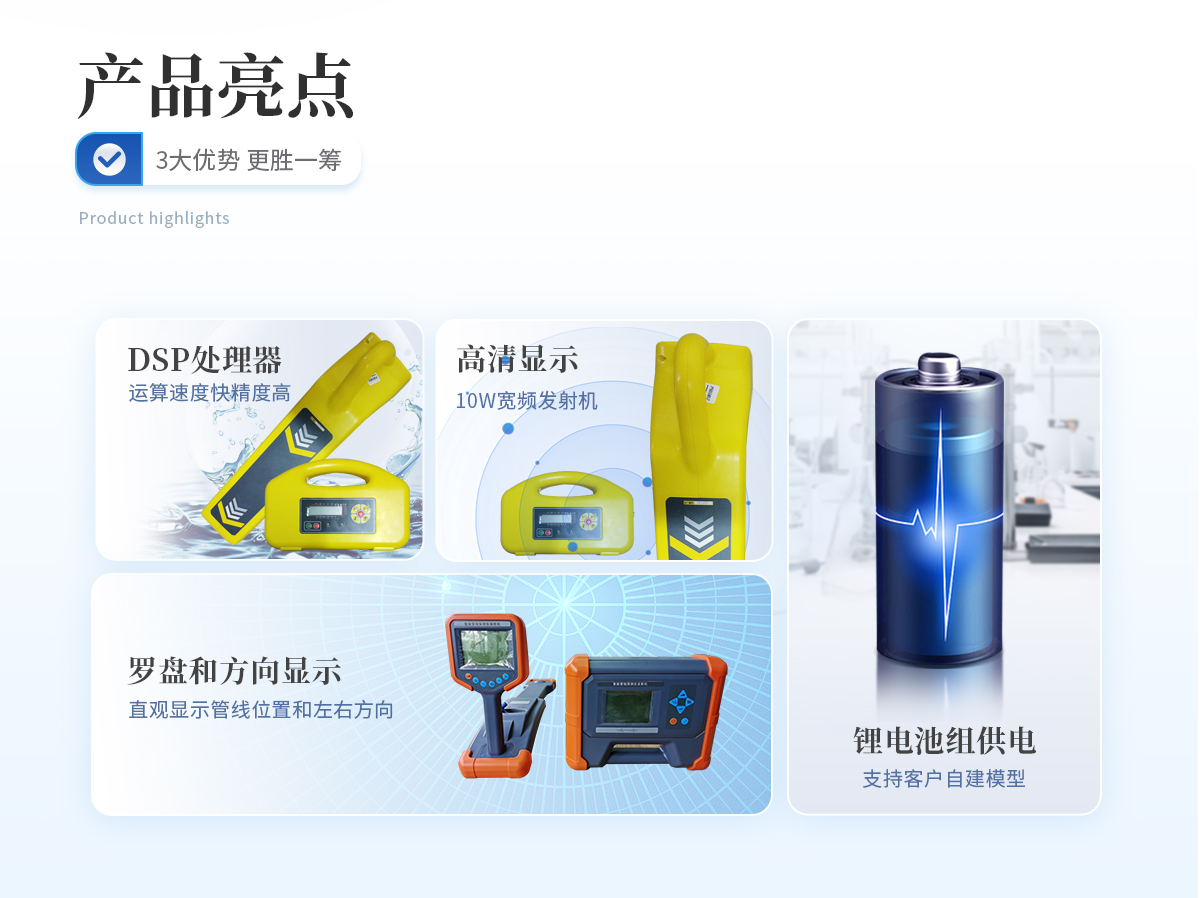 | 1、采用DSP處理器,運算速度快,精度更高; | 2、帶有導向功能指標管線走向,定位更快; | 3、采用10W寬頻發(fā)射機,適應各種環(huán)境的探測; | 4、接收機和發(fā)射機都采用鋰電池組供電,節(jié)能環(huán)保,每年可節(jié)省3000-5000元的電池費用。 |