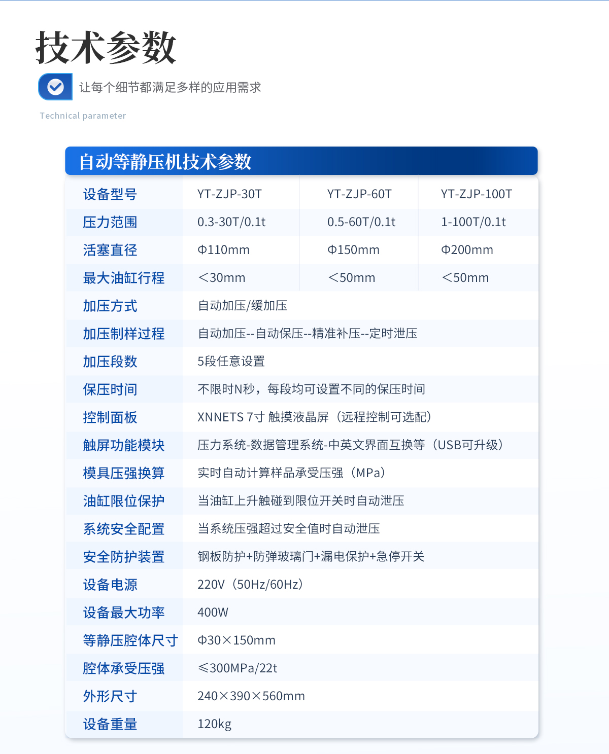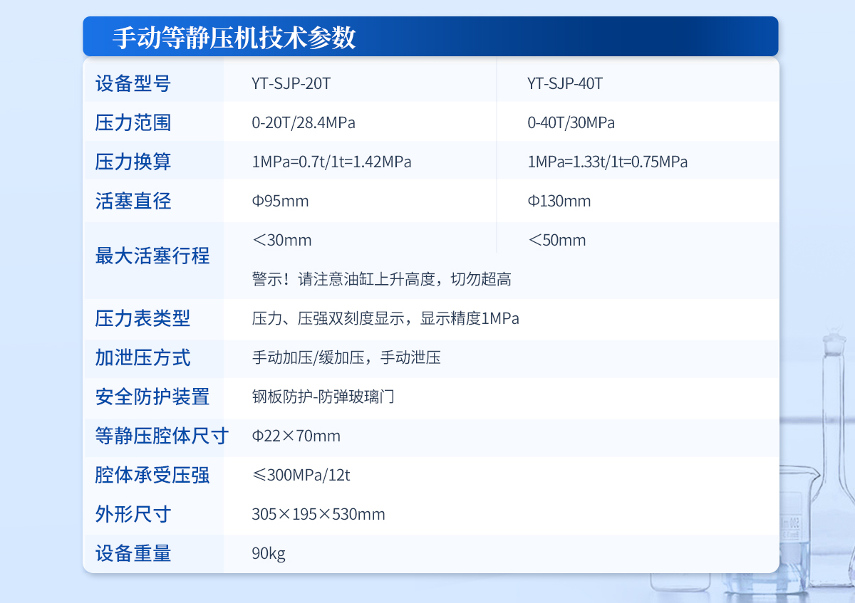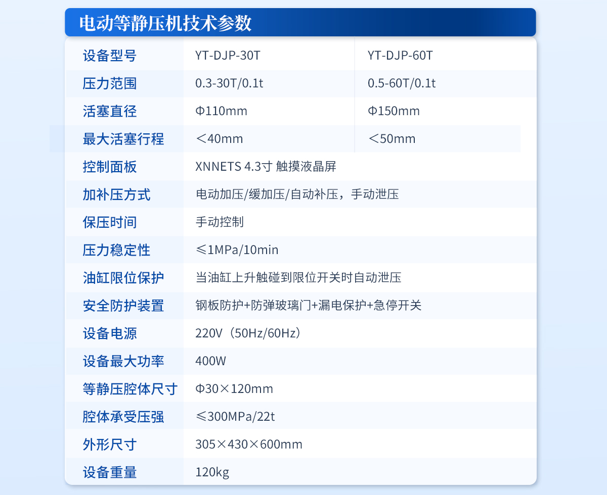 產品描述:設備簡介: 該機采用電動液壓驅動,分體式結構,智能化的程序控制系統,安全可靠的防護裝置,制樣完畢可輕松拖動等靜壓腔體至取樣平臺,其操作簡便,取樣方便,適合需要大噸位、大物件樣品的等靜壓實驗。 主要技術參數: 規格型號:YT-DJP-65TZ【詳情】  更新時間:2026-04-16