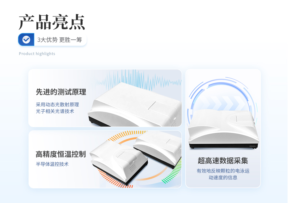 | 雙波長激光器,全自動切換 獨家采用雙波長(λ= 405nm、λ= 532nm)激光器搭建而成的光路系統,相關譜探測系統不僅體積小,而且具有很強的抗干擾能力,從而保證了測試的穩定性;對某些具有吸光屬性,傳統單一波長激光器無法檢測的樣品,可進行有效檢測; | **的測試原理 采用動態光散射原理和光子相關光譜技術,根據顆粒在液體中的布朗運動速度測定顆粒大小。大小顆粒運動速度不同,激光照射這些顆粒,不同大小的顆粒將使散射光發生快慢不同的漲落起伏。光子相關光譜法就根據特定方向的光子漲落起伏分析其顆粒大小。 | 超高速數據采集 使用PCS技術測定納米級顆粒大小,必須能夠分辨納秒級信號起伏。本儀器的核心部件采用我公司研制的CR256數字相關器,具有識別8ns的**分辨能力和**的信號處理速度,其數據處理速度高達162M。它能實時完成動態散射光強的采集和自相關函數運算,從而有效地反映不同大小顆粒的動態分光散射信息,為測試結果的準確性典型基礎。 | 高靈敏度和信噪比 采用專業級高性能光電倍增管,對光子信號具有**的靈敏度和信噪比。 | 高精度雙溫控保護系統 采用半導體溫控技術,樣品池溫控系統和激光器溫控系統精度高達±0.1℃,使被測樣品和激光器光源在整個測試過程中都處于恒溫狀態,避免溫度變化對不測試結果的影響,確保測試準確和重復; | 穩定的光路系統 采用光纖技術搭建而成的光路系統,使光子相關譜探測系統不僅體積小,而且具有很強的抗干擾能力,從而保證了測試的穩定性。 |