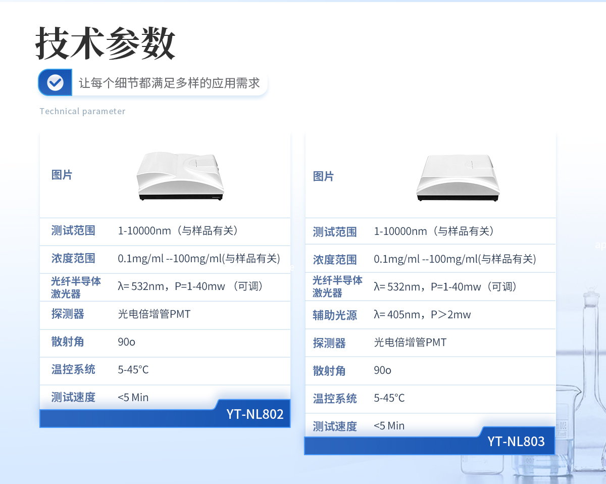 | 規格型號:YT-NL803 | 執行標準:GB/T 19627-2005/ISO 13321-1996 GB/T 29022-2012/ISO 22412-2008 | 測試范圍 :1-10000nm(與樣品有關) | 濃度范圍:0.1mg/ml--100mg/ml(與樣品有關) | 準確度誤差:<1%(國家標準樣品D50值) | 重復性誤差:<1%(國家標準樣品D50值) | 激光光源:光纖半導體激光器,λ= 532nm,P=1-40mw(可調) 輔助激光器,λ= 405nm,P>2mw | 探測器:光電倍增管PMT | 散射角:90o | 樣品池體積:10mm*10mm*40mm, 1--4mL | 溫控范圍:5-45℃ | 溫控精度:0.1℃ | 測試速度:<5 Min |