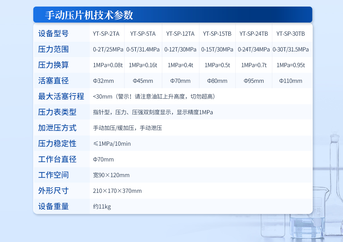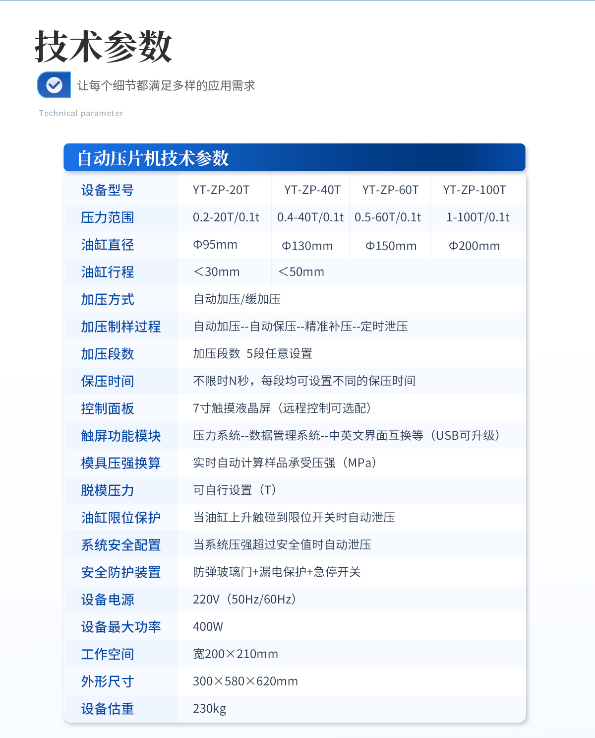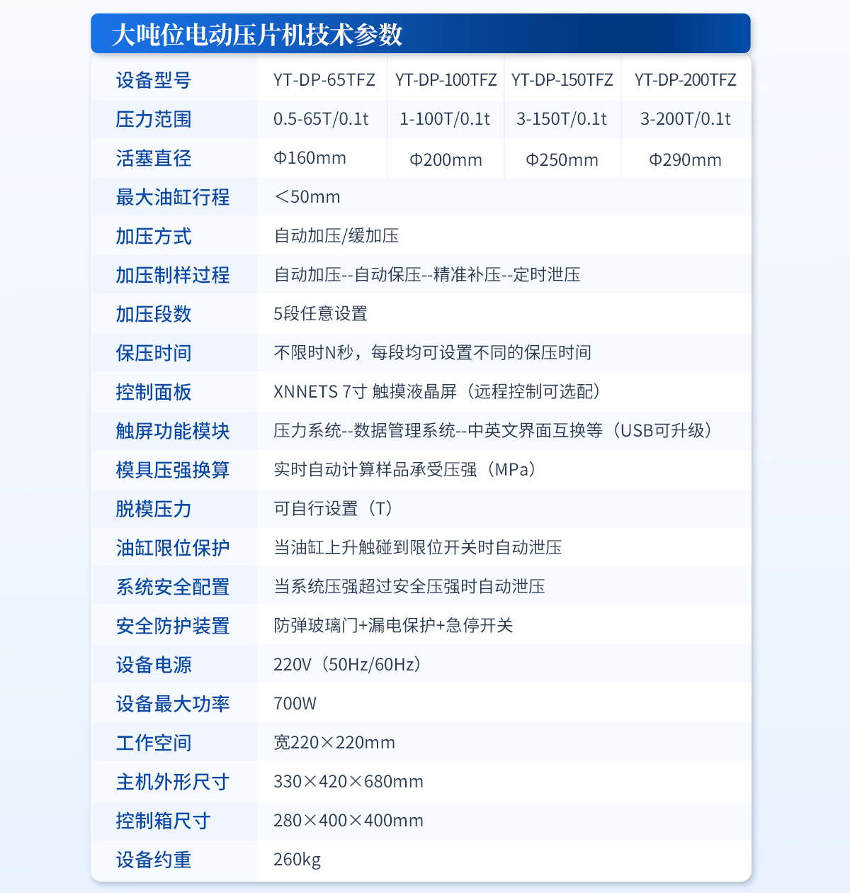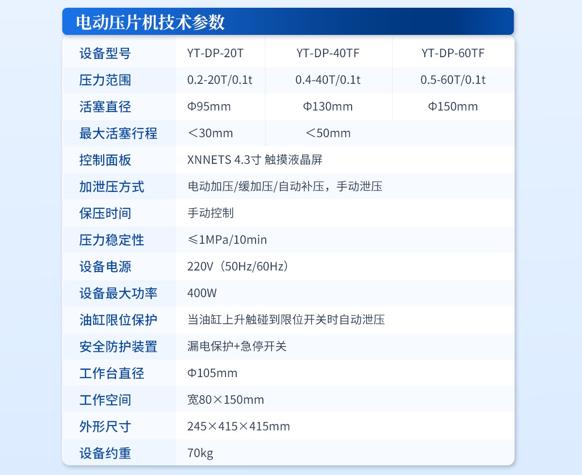| 設備型號:YT-ZP-100T | 壓力范圍:1-100T/0.1t | 油缸直徑:Ф200mm | 油缸行程 :<50mm | 加壓方式:自動加壓/緩加壓 | 加壓制樣過程:自動加壓--自動保壓--精準補壓--定時泄壓 | 加壓段數(shù):5段任意設置 | 保壓時間:不限時N秒,每段均可設置不同的保壓時間 | 控制面板:XNNETS 7寸 觸摸液晶屏(遠程控制可選配) | 觸屏功能模塊:壓力系統(tǒng)--數(shù)據(jù)管理系統(tǒng)--中英文界面互換等(USB可升級) | 模具壓強換算:實時自動計算樣品承受壓強(MPa) | 脫模壓力:可自行設置(T) | 油缸限位保護:當油缸上升觸碰到限位開關時自動泄壓 | 系統(tǒng)安全配置:當系統(tǒng)壓強超過安全值時自動泄壓 | 安全防護裝置:防彈玻璃門+漏電保護+急停開關 | 設備電源:220V(50Hz/60Hz) | 設備**功率:400W | 工作空間: 寬200×210mm | 外形尺寸 :300×580×620mm | 設備估重 :230kg | 配置說明:壓片機1臺,模具選配!可根據(jù)需求定制壓片機或模具 |