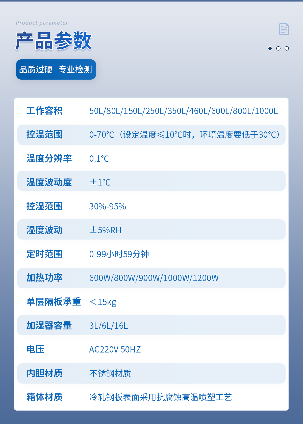 | 工作容積:150L | 控溫范圍:0-70℃(設定溫度≤10℃時,環境溫度要低于30℃) | 程序控制:24段 | 溫度分辨率:0.1℃ | 溫度波動度:±0.5℃ | 控濕范圍:30%-95% | 濕度波動:±5%RH | 定時范圍:0-99小時59分鐘 | 加熱功率:600W | 內箱尺寸 寬*深*高(cm):52*39*73 | 外箱尺寸 寬*深*高(cm):69*64*138 | 隔板層數(標配):2層 | 層間隔/mm:64 | 卡槽層數:8 | 加濕器容量(標配):3L | 單層隔板承重:<15kg | 底部總承重 :25kg | 電壓:AC220V 50HZ | 整機重量:80kg | 內膽材質:8K鏡面不銹鋼 | 箱體材質:冷軋鋼板表面采用抗腐蝕高溫噴塑工藝 | 旗艦款升級項目:升級內置鋼化玻璃門,內置220V電源插座。 |