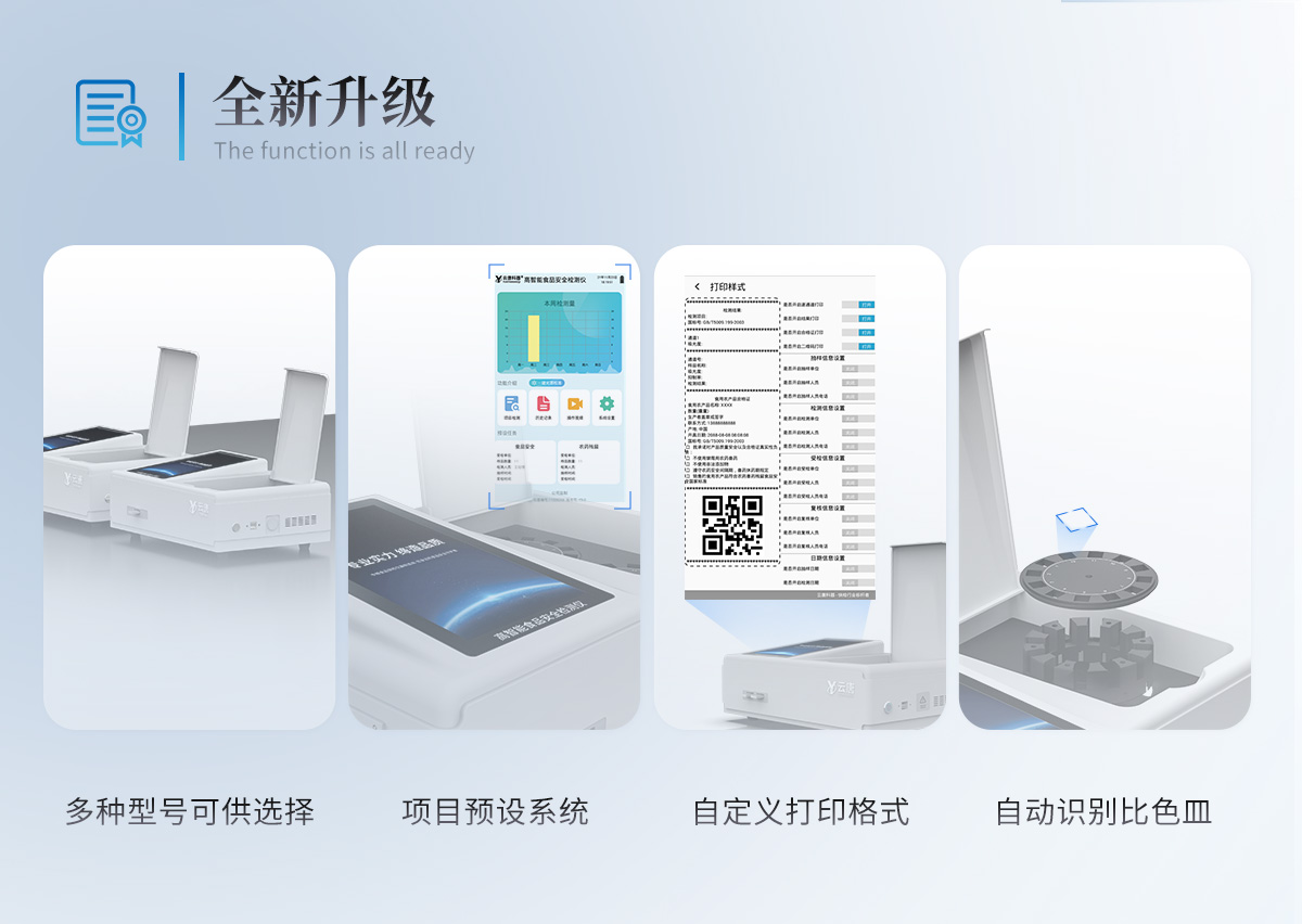 | 儀器采用臺(tái)式一體化系統(tǒng)檢測(cè)技術(shù),將分光光度模塊、膠體金檢測(cè)模塊、新型農(nóng)殘檢測(cè)模塊、數(shù)字化管理模塊、無(wú)線通訊模塊高度集成于一體,支持檢測(cè)200種食品安全檢測(cè)項(xiàng)目,同時(shí)預(yù)留升級(jí)檢測(cè)方法。 | 儀器檢測(cè)模塊標(biāo)準(zhǔn)化、智能化,可隨意自由組合。檢測(cè)箱體內(nèi)置多個(gè)標(biāo)準(zhǔn)檢測(cè)單元,檢測(cè)模塊可以調(diào)整配置。 | 儀器采用全新安卓智能系統(tǒng),主控芯片采用 ARM Cortex-A7,RK3288/4核處理器,10.1寸高清液晶觸摸豎屏,更加**的UI交互界面,運(yùn)轉(zhuǎn)快捷;儀器配備無(wú)線通信模塊: 4G(APN)通訊模塊、Wifi模塊,藍(lán)牙傳輸,同時(shí)具有雙USB接口以及RJ45接口能以多種方式實(shí)現(xiàn)數(shù)據(jù)保存和數(shù)據(jù)傳輸功能。 | 創(chuàng)新檢測(cè)模式: | ★檢測(cè)通道:≥12通道;采用精密旋轉(zhuǎn)比色池設(shè)計(jì),使用同芯片同光源校準(zhǔn)精度,解決不同光源之間的誤差值。1-12通道間誤差0.1%。(***:**202022821055.2) | ★儀器具有自動(dòng)識(shí)別比色皿檢測(cè)功能,即:將樣品比色皿放入儀器后,點(diǎn)擊樣品檢測(cè),儀器自動(dòng)識(shí)別比色皿進(jìn)行通道檢測(cè)。 | 進(jìn)口高精光源: | 高精度進(jìn)口四波長(zhǎng)冷光源,通道配置 410、520、590、630nm 波長(zhǎng)光源,一個(gè)光源芯片驅(qū)動(dòng)一個(gè)光源,誤差極小,每臺(tái)設(shè)備單獨(dú)**校準(zhǔn)光源,**比對(duì),同時(shí)參照四種不同波段光源全方位覆蓋市面上99%的農(nóng)殘食品項(xiàng)目檢測(cè)。 | 膠體金模塊檢測(cè)方式: | 采用COMS實(shí)時(shí)成像技術(shù),可采集多個(gè)畫面,支持3個(gè)金標(biāo)同時(shí)讀卡,通過(guò)不同顏色的灰度變化,一秒精準(zhǔn)得出結(jié)果。 | 智能化操作系統(tǒng): | 便捷操作系統(tǒng):設(shè)備檢測(cè)時(shí)可在同一檢測(cè)界面自動(dòng)對(duì)應(yīng)相關(guān)檢測(cè)通道一次性選擇1-12個(gè)樣品名稱,無(wú)須退出界面,節(jié)省操作時(shí)間。 | 數(shù)據(jù)集成系統(tǒng):設(shè)備首頁(yè)自動(dòng)統(tǒng)計(jì)檢測(cè)數(shù)據(jù)包含:周檢測(cè)數(shù)據(jù)、月檢測(cè)數(shù)據(jù),全部檢測(cè)總數(shù)量,均包含檢測(cè)總數(shù),合格數(shù),不合格數(shù),以及相關(guān)柱形分析圖,對(duì)各項(xiàng)檢測(cè)數(shù)據(jù)清晰掌握,無(wú)需電腦查詢,更加快捷直觀。 | 項(xiàng)目預(yù)設(shè)系統(tǒng):支持添加單個(gè)及多個(gè)相同或不相同的任務(wù)預(yù)設(shè),一鍵快速調(diào)取,每一個(gè)任務(wù)分別可以設(shè)置不同的樣品、批次、編號(hào)、來(lái)源、備注、抽樣信息、檢測(cè)信息、受檢信息、復(fù)核信息等更多信息。無(wú)縫鏈接平臺(tái)和APP實(shí)時(shí)查看下發(fā)任務(wù)。 | 數(shù)據(jù)監(jiān)管系統(tǒng):同步對(duì)接監(jiān)管平臺(tái),數(shù)據(jù)可局域網(wǎng)和互聯(lián)網(wǎng)數(shù)據(jù)上傳,檢測(cè)結(jié)果可選擇直接傳至食品安全監(jiān)管平臺(tái)。集成OSS輸出存儲(chǔ)服務(wù)、區(qū)分設(shè)備定向管理應(yīng)用,進(jìn)行區(qū)域食品安全監(jiān)管及大數(shù)據(jù)分析處理與數(shù)據(jù)統(tǒng)計(jì),檢測(cè)區(qū)域食品安全長(zhǎng)短期動(dòng)態(tài),達(dá)到食品安全問(wèn)題預(yù)估、預(yù)警。 | 自定義打印系統(tǒng):內(nèi)置全新打印系統(tǒng),新創(chuàng)自定義打印方式,可按需靈活設(shè)置開啟或關(guān)閉:產(chǎn)品合格證(國(guó)家農(nóng)業(yè)部標(biāo)準(zhǔn)要求),二維碼,抽樣信息、檢測(cè)信息,受檢信息、復(fù)核信息、抽樣日期、檢測(cè)日期等信息的打印。 | 系統(tǒng)遠(yuǎn)程更新功能:可定向分客戶分儀器更新系統(tǒng),按照不同客戶后期實(shí)際需求添加項(xiàng)目,無(wú)需機(jī)器返廠,即可遠(yuǎn)程實(shí)時(shí)升級(jí)全新系統(tǒng),節(jié)省時(shí)間成本及避免運(yùn)輸造成設(shè)備損壞。 | 儀器主機(jī)采用一體化防水、抗壓、防撞擊、防腐蝕箱體設(shè)計(jì),同時(shí)配備交直流供電,可連接車載電源,可選配大容量充電鋰電池,滿足現(xiàn)場(chǎng)野外檢測(cè)需求。 | 安全證書,放心保障:儀器具有中國(guó)計(jì)量科學(xué)研究院校準(zhǔn)證書,權(quán)威認(rèn)證。 |