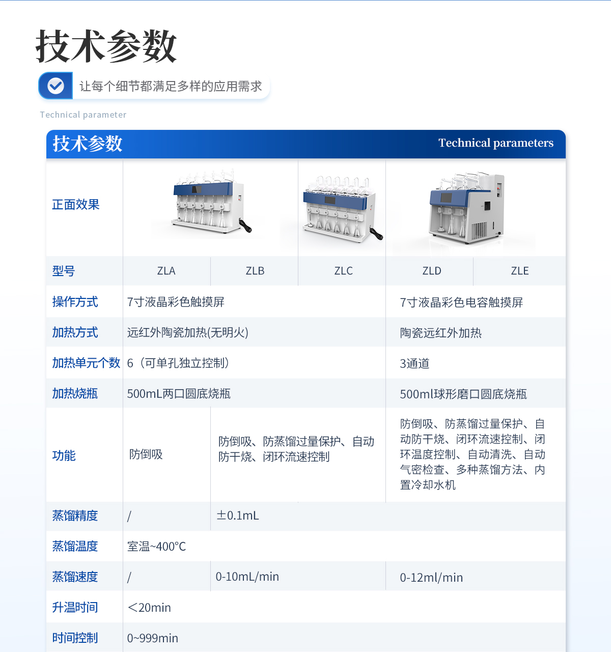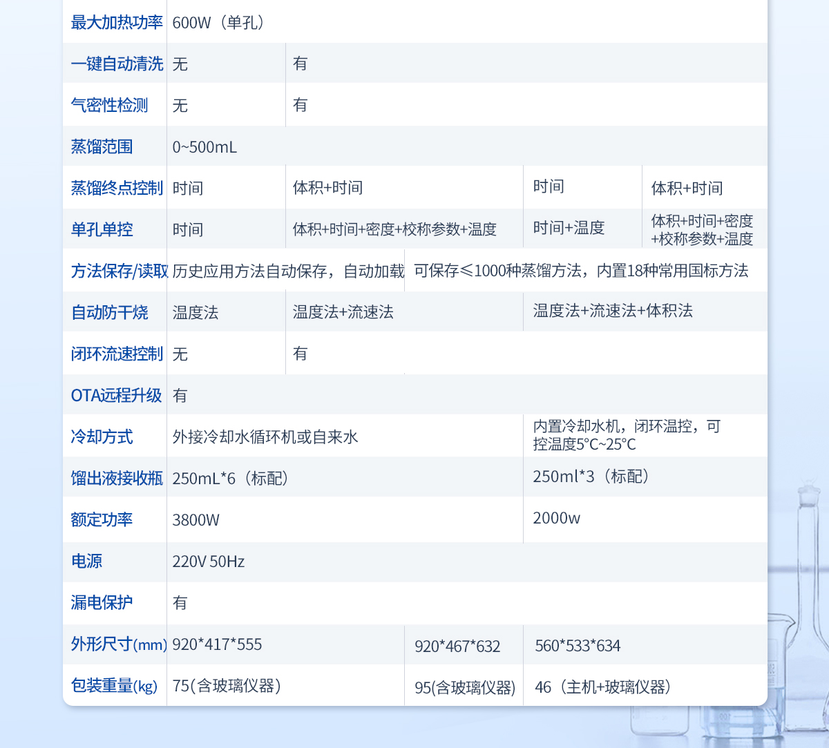 | 功能 | 防倒吸、防蒸餾過量保護、自動防干燒、閉環流速控制、閉環溫度控制、自動清洗、自動氣密檢查、多種蒸餾方法、內置冷卻水機 | |